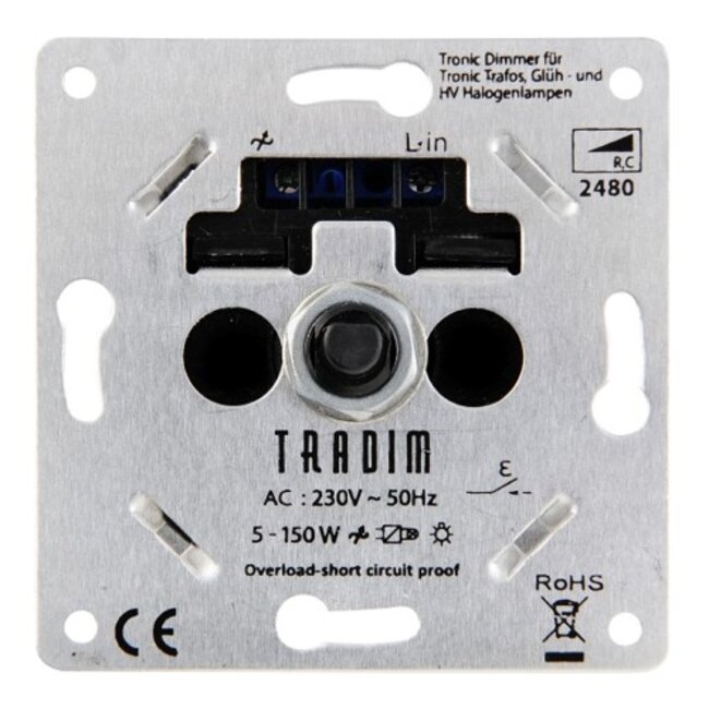 Deze Tradim 2480EXOP druk-/draai dimmer LED dimmer (dit is een fase afsnijding dimmer) is geschikt voor gebruik van laagvolt (12 Volt) LED lampen welke gebruik maken van een driver / transformator, van minimaal 5 en maximaal 150 Watt. Tevens is de dimmer voorzien van hotelschakeling.